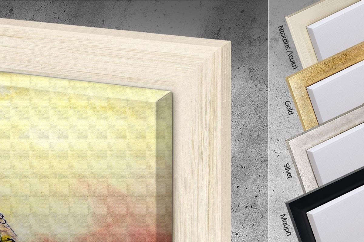 Μπορείτε να επιλέξετε ανάμεσα από 3 τύπους με 4 χρωματικές επιλογές ανά τύπο, Κλασική κορνίζα, κορνίζα Σκοτία και κορνίζα Πλάτη.