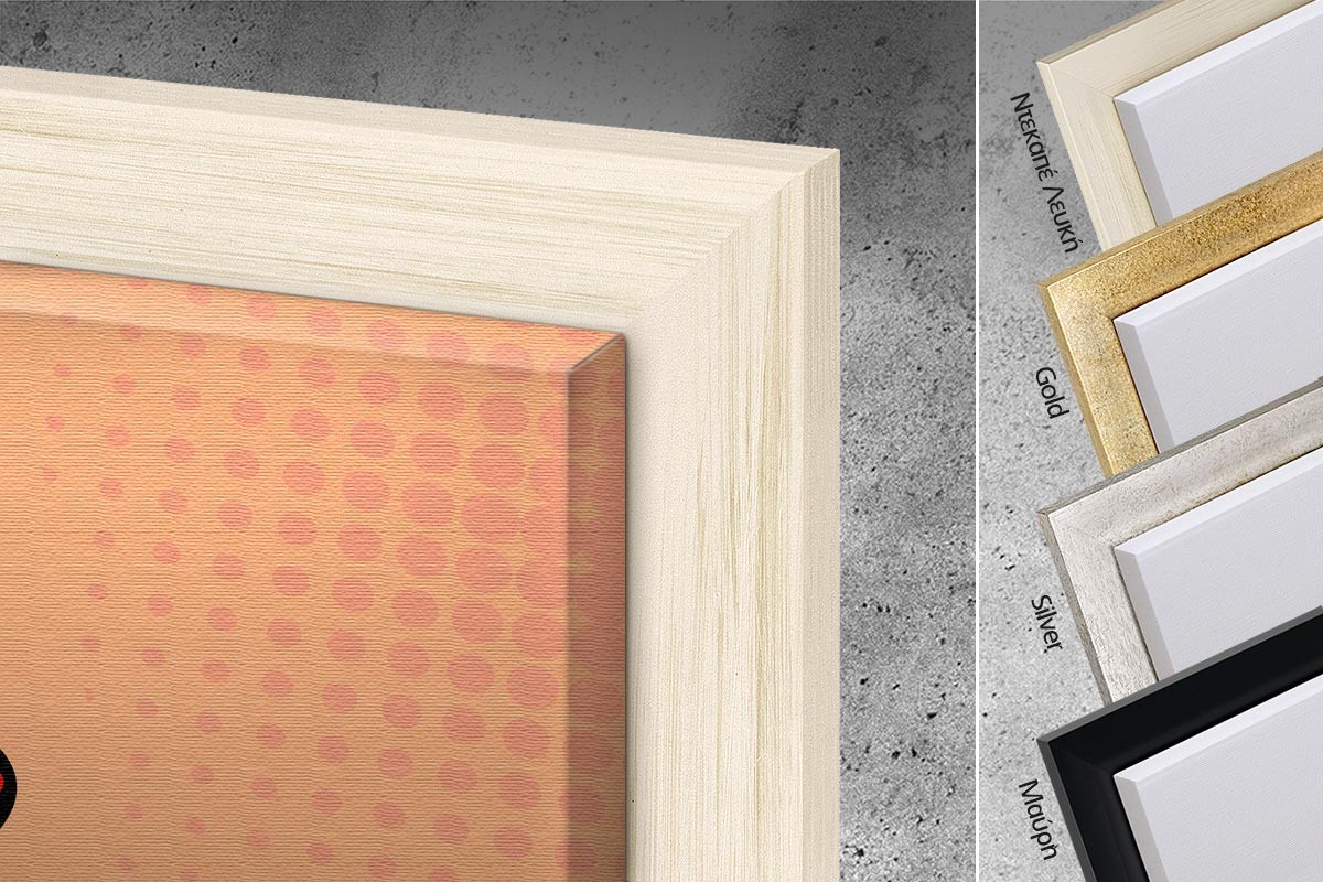 Μπορείτε να επιλέξετε ανάμεσα από 3 τύπους με 4 χρωματικές επιλογές ανά τύπο, Κλασική κορνίζα, κορνίζα Σκοτία και κορνίζα Πλάτη.