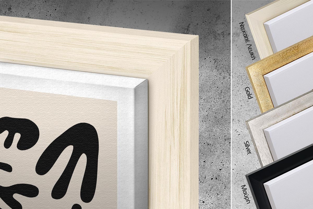 Μπορείτε να επιλέξετε ανάμεσα από 3 τύπους με 4 χρωματικές επιλογές ανά τύπο, Κλασική κορνίζα, κορνίζα Σκοτία και κορνίζα Πλάτη.