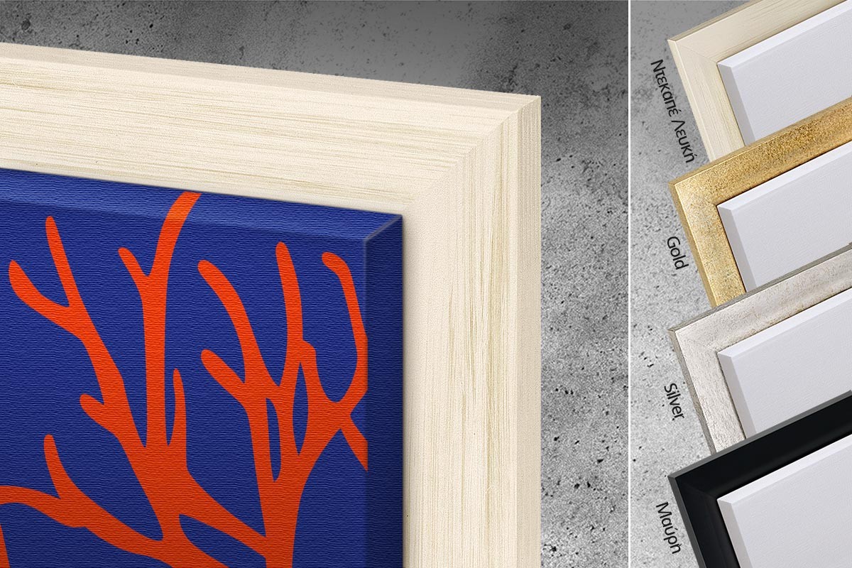 Μπορείτε να επιλέξετε ανάμεσα από 3 τύπους με 4 χρωματικές επιλογές ανά τύπο, Κλασική κορνίζα, κορνίζα Σκοτία και κορνίζα Πλάτη.