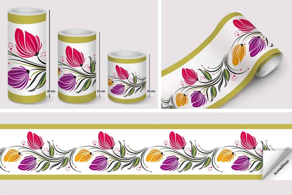 - Αυτοκόλλητη μπορντούρα μπορεί να εφαρμοστεί σε οποιαδήποτε λεία, καθαρή και στεγνή επιφάνεια τοίχων, πλακιδίων, γυαλιού, επίπλων, ντουλαπών κ.λπ.