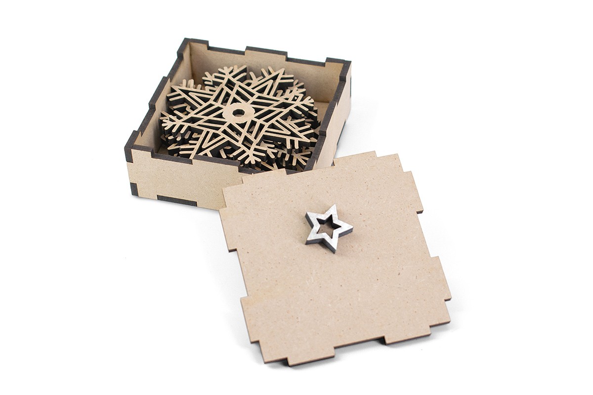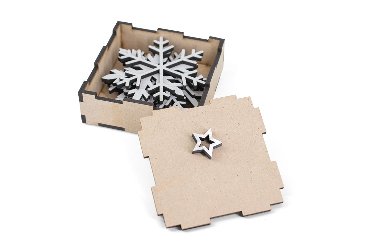 Σετ με 6τμχ. φυσικό χρώμα σε ξύλινο κουτί 10x10x3,5: Περιλαμβάνει 6 χιονονιφάδες 9x9 εκ. σε διάφορα σχέδια, με φυσικό σπάγκο μέσα σε ξύλινο κουτί